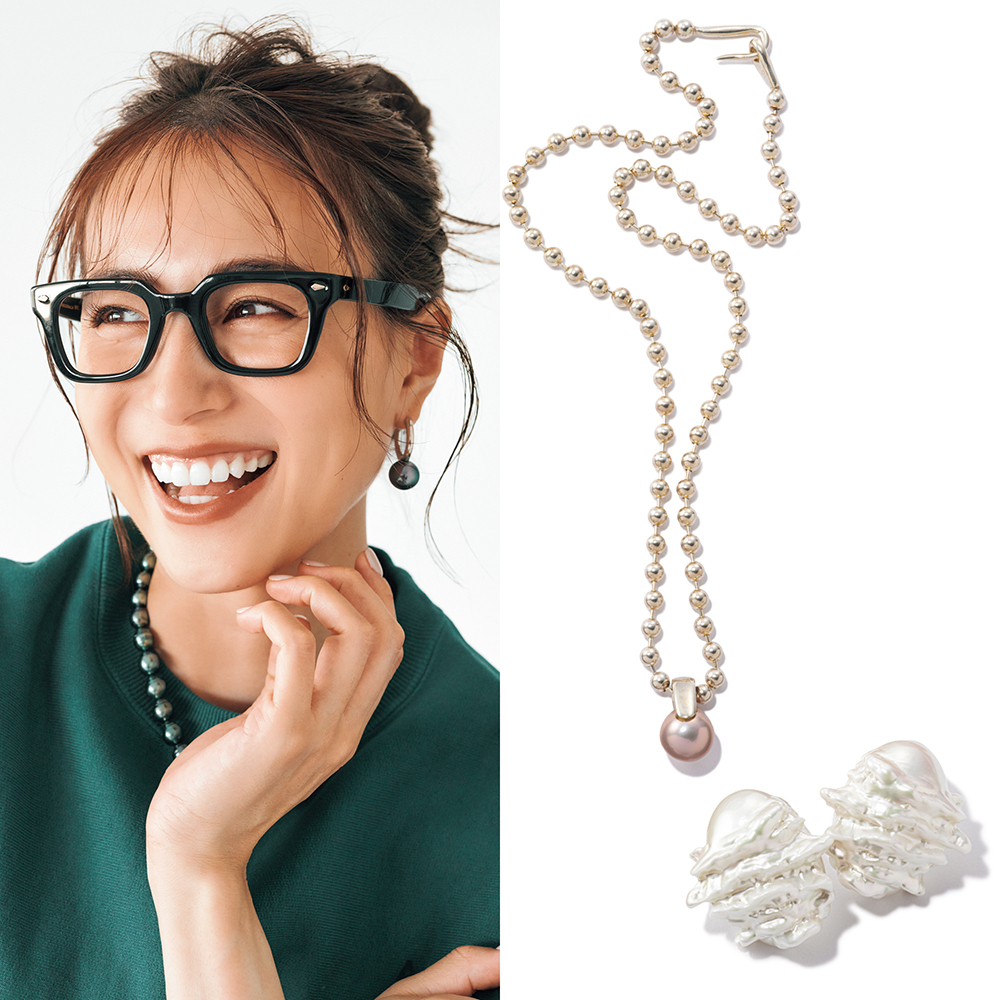 ブラックパールネックレス¥242,000(マリコ ツチヤマ/エスケーパーズオンライン)ピアス¥13,200(ステラハリウッド)スウェット¥39,600(ATON/エイトン青山)タックパンツ¥47,300(エブール/エブール GINZA SIX店)眼鏡¥44,000(モスコット/モスコット トウキョウ)バッグ¥36,300(バケット バゲージ/アイネックス)ローファー¥59,400(パープレッド)
