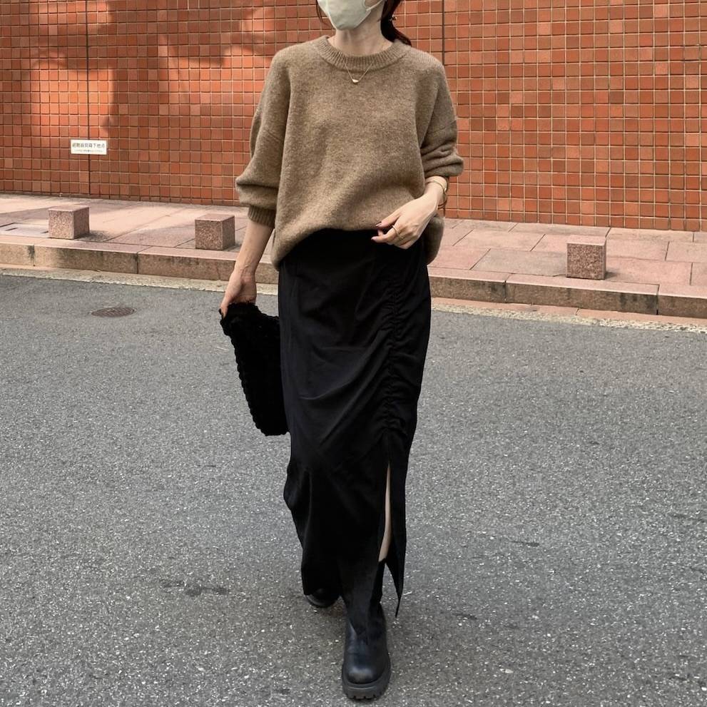 【秋編】太って見えないニットコーデ⑤ブラウンニット×黒スカート