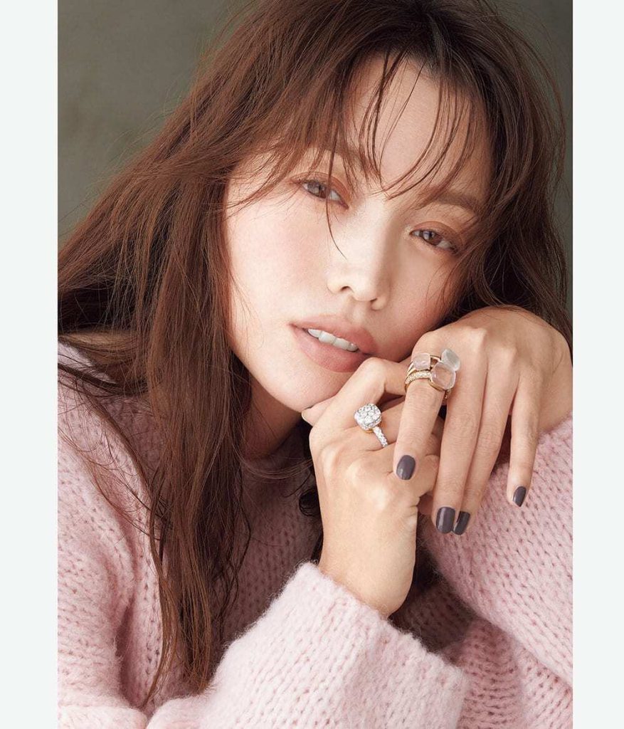 リングすべて「ヌード」〈左手リング指先側から〉[K18RG×WG、ブラウンダイヤモンド、ローズクォーツ、カルセドニー]¥682,000[K18RG×WG、ローズクォーツ]¥264,000[K18RG×WG、ホワイトトパーズジュレ、マザーオブパール]¥396,000〈右手〉[K18RG×WG、DIA]¥1,749,000(すべてポメラート/ポメラート クライアントサービス)ニット¥26,400(エイチ ビューティー&ユース)