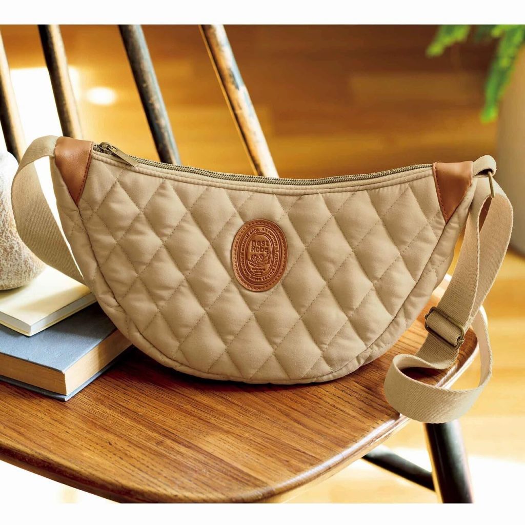 リンネル 1月号の付録は、nest Robeのキルティング仕上げ! 三日月ショルダーバッグ。温かみのあるベージュカラーにキルティング素材と本格レザー調の切り替えで高級感のあるデザインに仕上がっています。内ポケットも完備しお財布やスマホ、コスメまで必要最低限のお出かけアイテムがすっぽり収納できますよ。