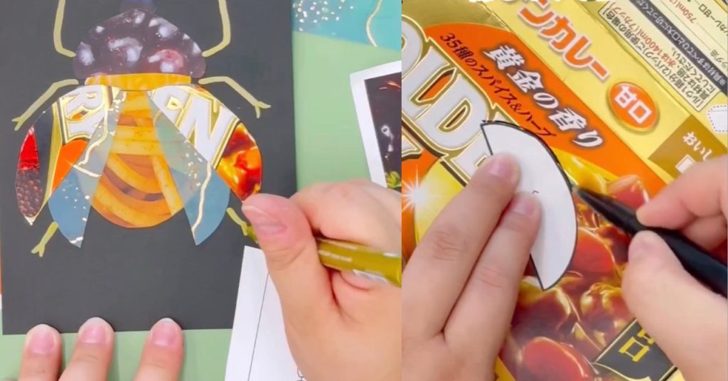 身近にある食料品のパッケージや包装紙を切り抜いて、パズルのように貼り付けたら、世界に1匹のオリジナルの虫が爆誕!