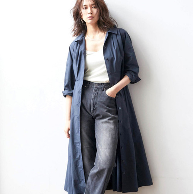 さっと羽織るだけでサマになるAラインシルエットのダウンコート。ノーカラータイプならフェミニンに着こなせるので、キレイ派の方にもおすすめです。