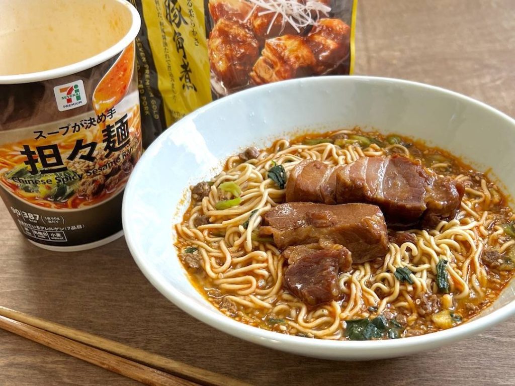 セブン-イレブンの「担々麺」に「金の豚角煮」をのせると、おいしいけれどかなり罪な味。「今日はガツンといきたい!」というときにぴったりの1杯です。