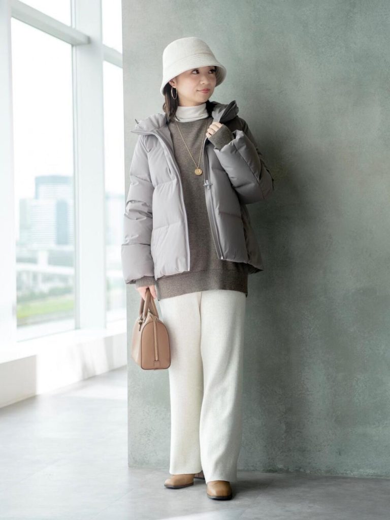 暖かいニットですが厚手ではないので、重ね着しても着膨れしにくい魅力も。中綿ベストを羽織り、ボリュームマフラーを巻いたコーデでも、ニットのおかげでスッキリとして見えます。