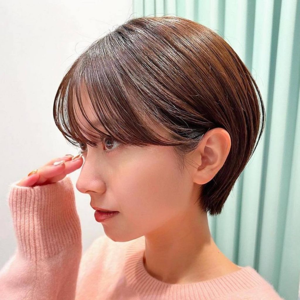 すっきり感のあるショートヘアにゆるっとくびれた前髪を合わせると、グッとこなれ感が引き上がります。