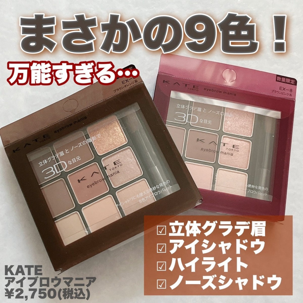 ケイトから限定発売された「アイブロウマニア」は、なんと9色入り。アイシャドウのようにアイブロウメイクを楽しめるように作られた、こだわりパレットなんです。