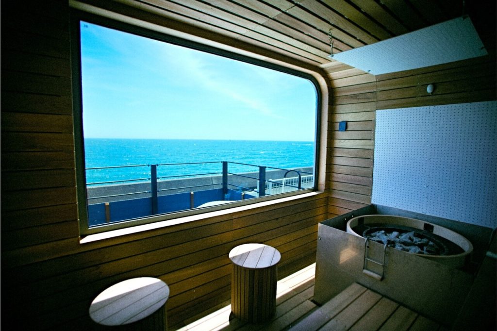 セルフロウリュで芯までじっくり温まったら、そのまま専用デッキに設けられた水風呂へ。海まで数メートルというバツグンのロケーションで、水平線や富士山を眺めながらの極上のととのい体験を心ゆくまで堪能して。