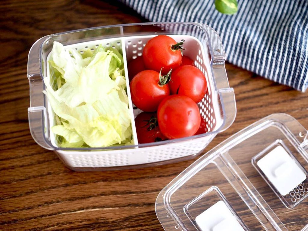 中身のみやすいクリア容器に、仕切り付きの水切りカゴや、空気を入れ替えるためのスライド式換気口がついた本商品。一般的な保存容器とは異なり、野菜の鮮度を保つための工夫がちりばめられています。