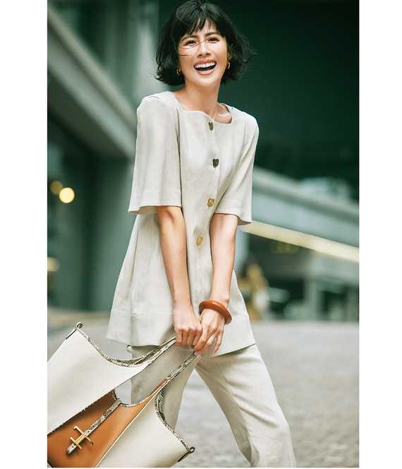 「どうしてもぼやっと見えがちなので、素材が異なるものやカラーバッグを合わせたのがポイント。セリーヌのスニーカーは厚底で脚長効果あり、さりげないロゴも気に入っています」