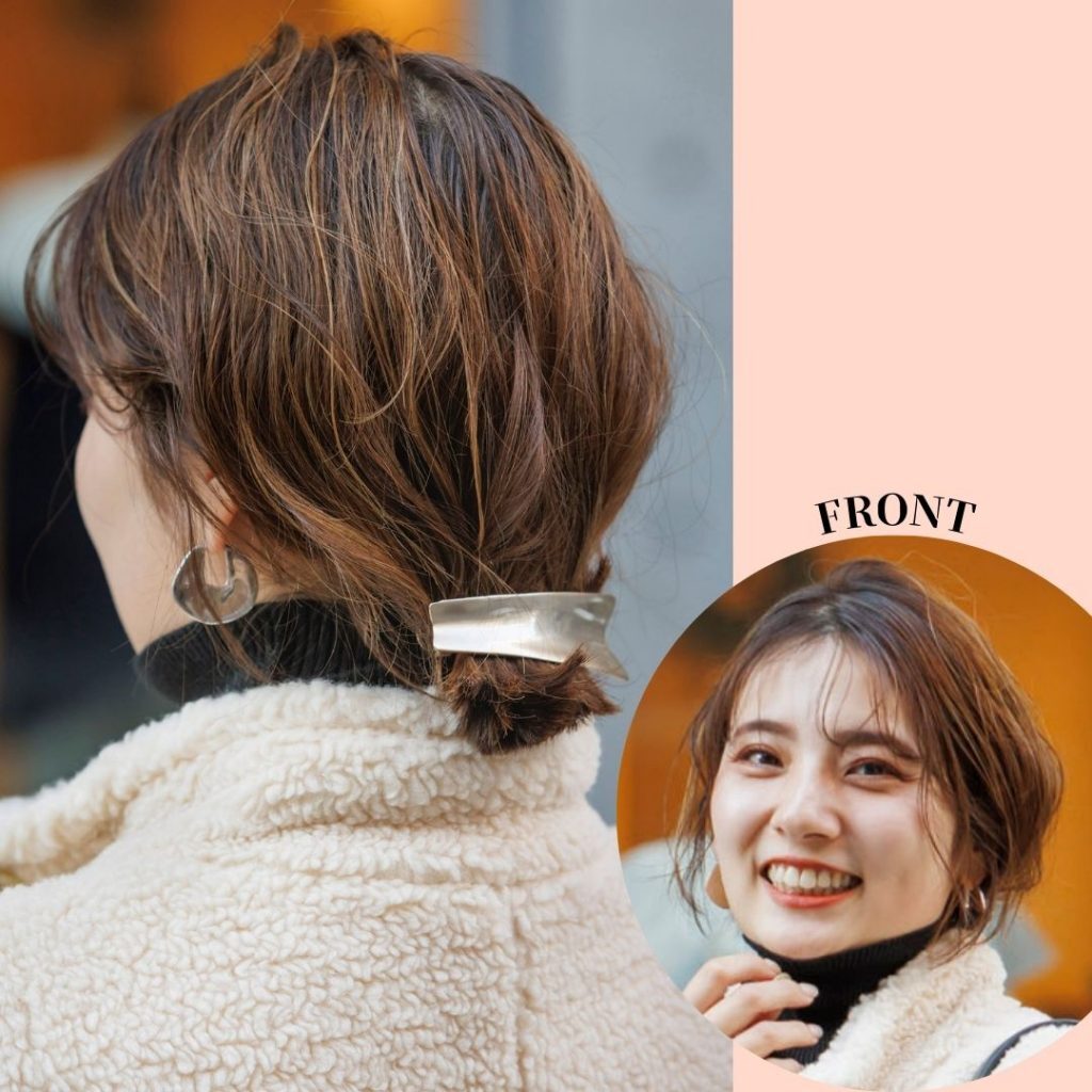 「髪が短いので、ひとまとめにしても可愛いバレッタを探していてシーズマーラで発見! シンプルでモード感があるところがお気に入り。全体を緩めに巻いてゴムでくくらず挟むだけ。そのほうが毛先が広がって可愛いんです」青野未来さん・163㎝(フリーモデル/8歳の男の子と5歳の女の子ママ)