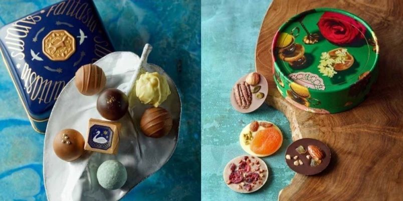 (左上から時計回りに)メリーチョコレート はじけるキャンディチョコレート。「プリンアラモード缶」(18個入)2160円、GARNIER「ガルニエG」(5個入)1404円、RURU MARY’S「マンディアンのチョコレート」(7枚入)2268円、キツネとレモン「白鳥のファンタジア」(9個入)1080円