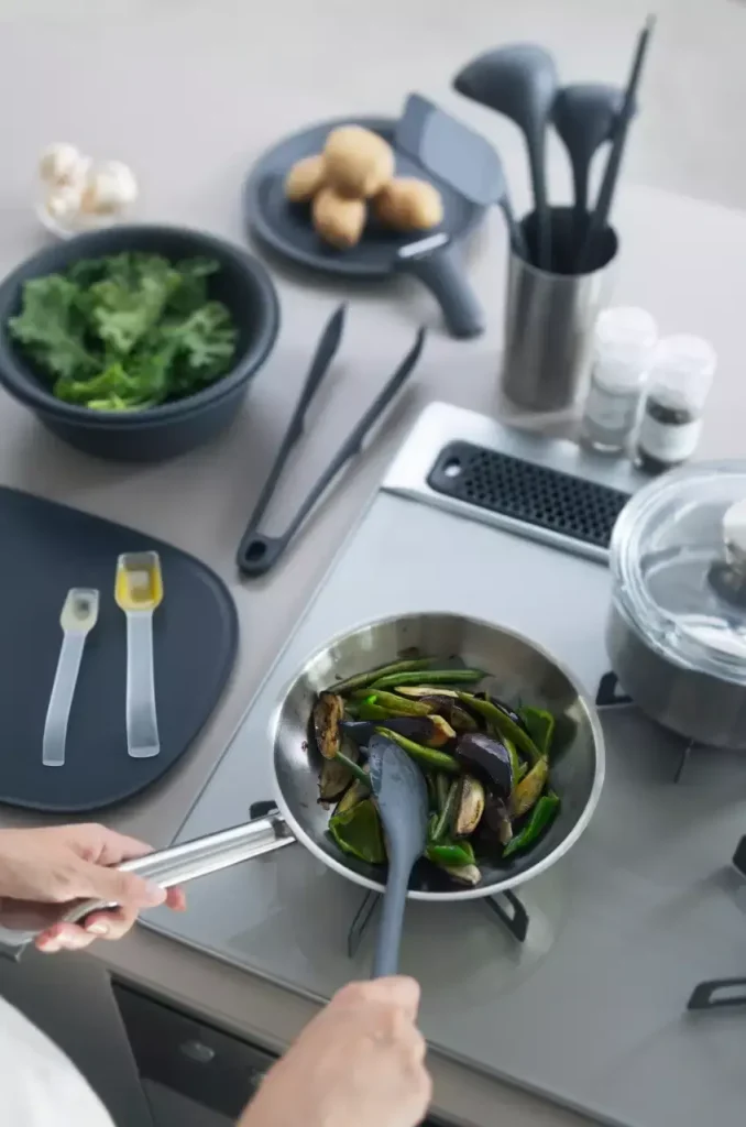 木べらのようなフラットな柄とコンパクトな幅で小回りがきくから、炒める時もストレスフリー。スプーンのフチがシリコーンになっているから鍋肌にフィットして残さずすくえて、忙しい時でもサッと移すことができますよ。