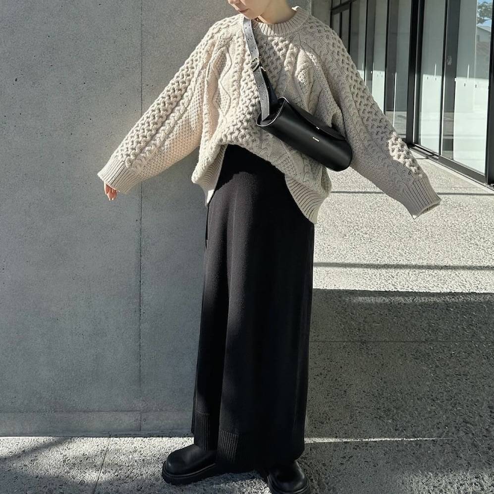 トップス選びに悩んだら、ケーブル編みが冬らしいカラーニットを合わせてみて♡