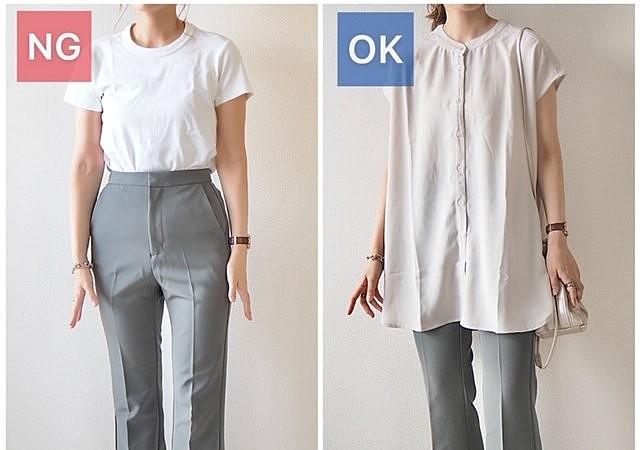 さりげない肌見せができるトップスなら、スッキリ見えは確実。どことなく女っぽさが香るトップスには、クリーンなホワイトのパンツがベストマッチ。