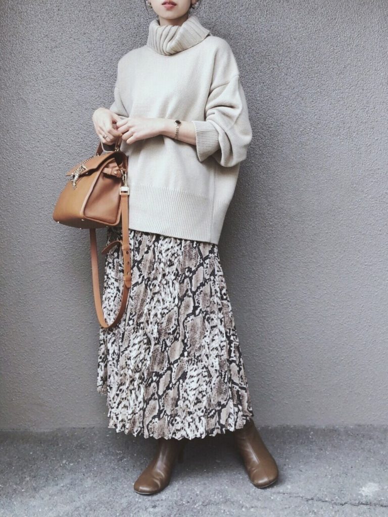 柄スカートを投入して、定番のベージュコーデをブラッシュアップ。ほっこり感の出やすいタートルニットの着こなしも、パイソン柄のスカートで洗練モードな印象に。