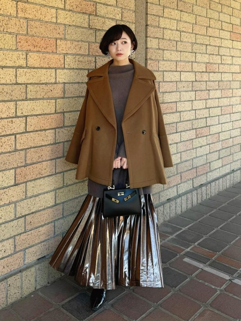 きらめく光沢のプリーツスカートを選べば、冬コーデが手軽に華やぎます。ロングコートからミドル丈・ショート丈にシフトして、真冬っぽさから脱却しましょう。ブーツや浅めのハイネックで防寒は忘れずに!