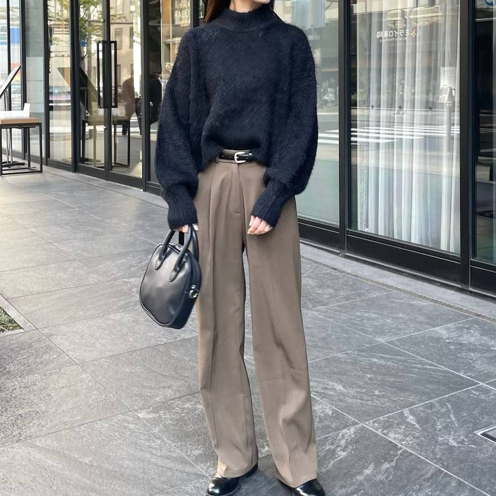 【冬編】垢抜けるパンツコーデ⑤黒ニット×ブラウンパンツ