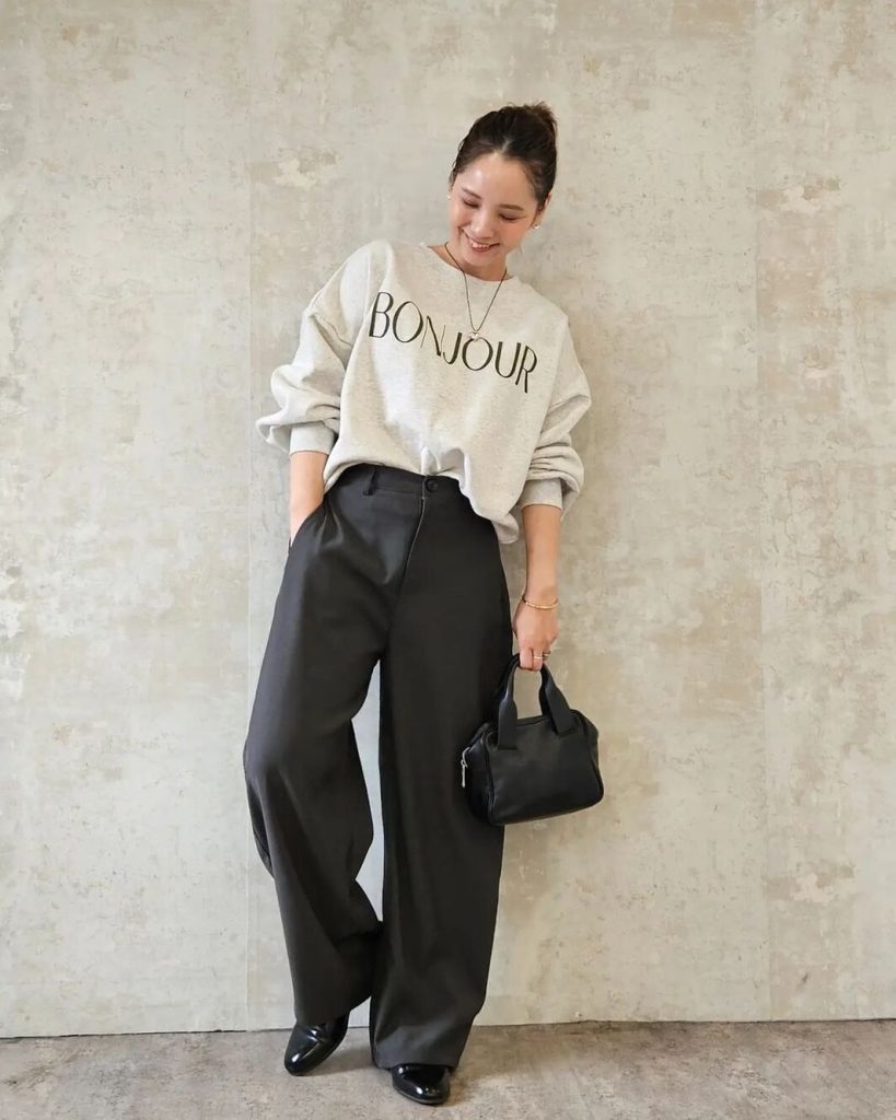 リラックス感ときちんと感が両立した大人バランスなカジュアルスタイル。スラックスやレザーバッグでキレイめ要素をプラスすすれば、スウェットでもカジュアルに傾きすぎません。