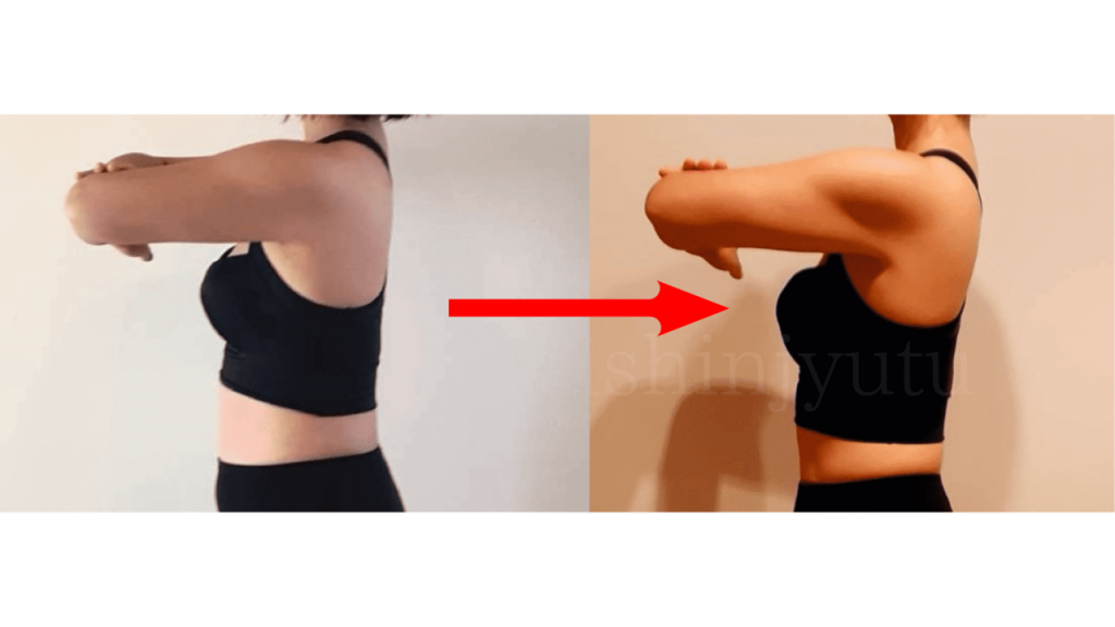 肩の位置が前にあることで、巻き肩になっていきます。肩の位置の見方は、横から見た時に、腕が耳より後ろ側にあれば正常、前になっていれば巻き肩です。巻き肩になることで、二の腕と背中・肩甲骨をつなぐ筋肉(広背筋や大円筋)が常に緩んだ状態になります。 そして、巻き肩のまま運動することで、二の腕が痩せないだけでなく、首や肩、腰にも負担がかかり、痛みや不調の原因にもなります。