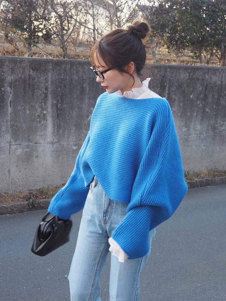 鮮やかなカラーニットにフリルトップスをレイヤード。ニット&デニムの定番の組み合わせも、フリルトップスをレイヤードすることでお洒落上級者な着こなしに。