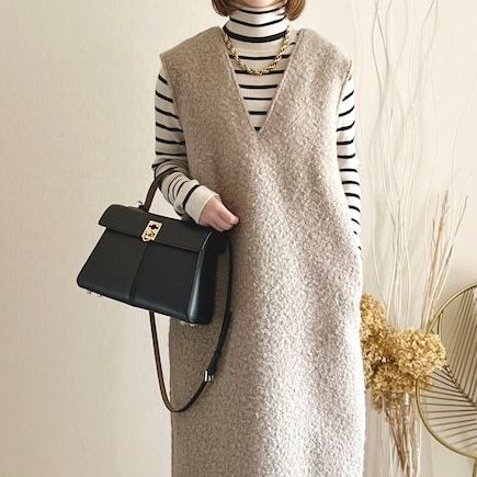 メリノウール100%のリブタートルネックニットにはボーダー柄もあります。遠くからでも目を惹く柄で、きれいめカジュアルにベストマッチ。ファーベストを合わせれば、ぬくもり感じる上品レイヤードコーデの完成です。