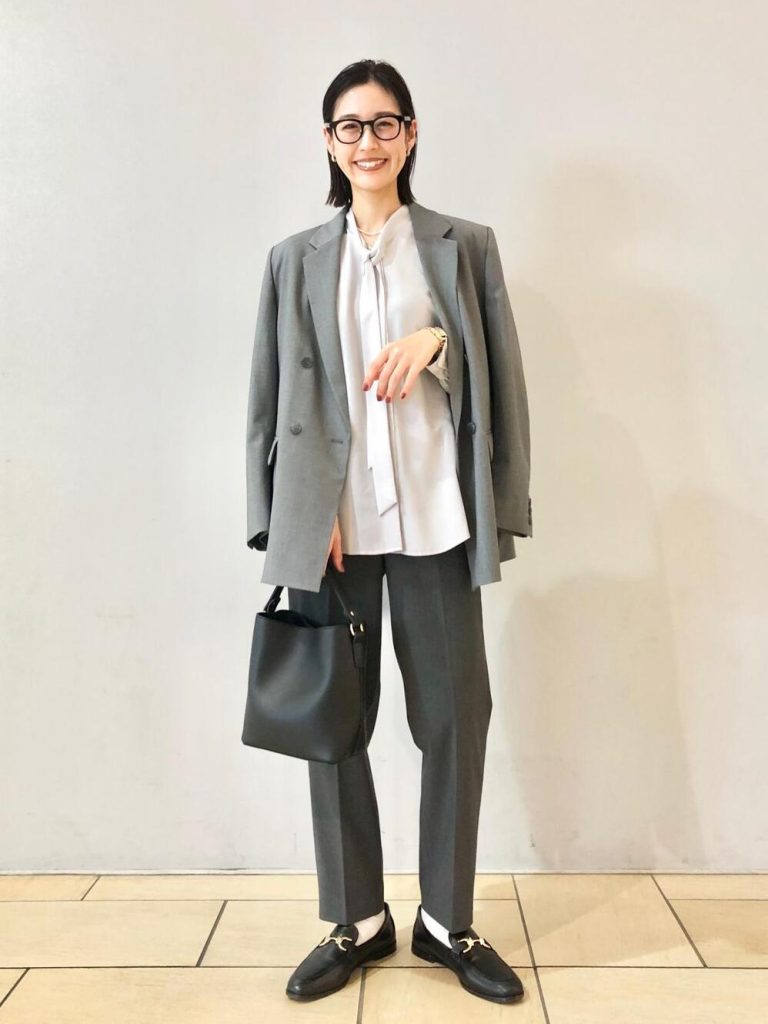 とろみのあるレーヨンブラウスは、着るだけできれいめコーデが完成します。ボウタイありなら上品さも格上げ。ジャケットを羽織り、ワイドパンツを合わせるときちんと感があって、セレモニーやオフィススタイルに◎。