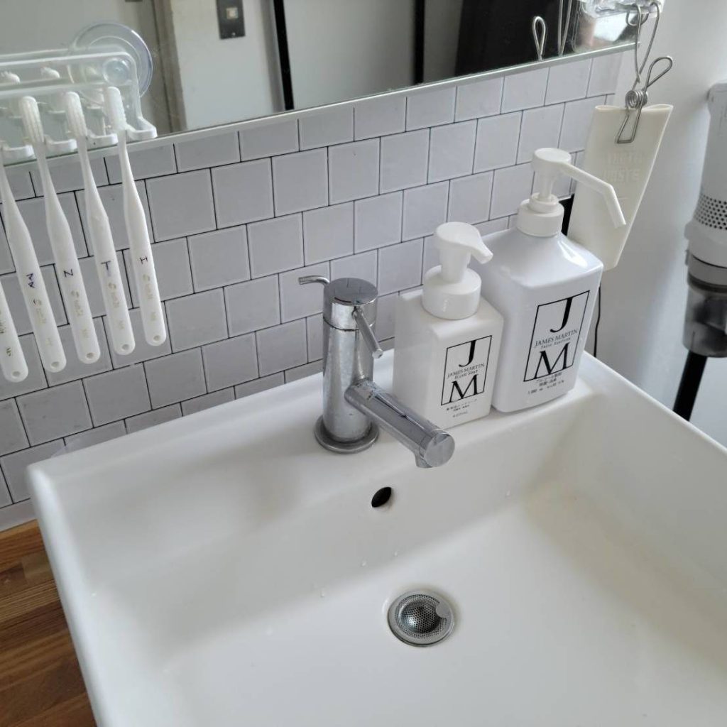 洗面所周りで使うアイテムは、できるだけシンプルで清潔な空間になるように、基本的には白やステンレスといったシンプルなカラーのアイテムを活用するようにしています。