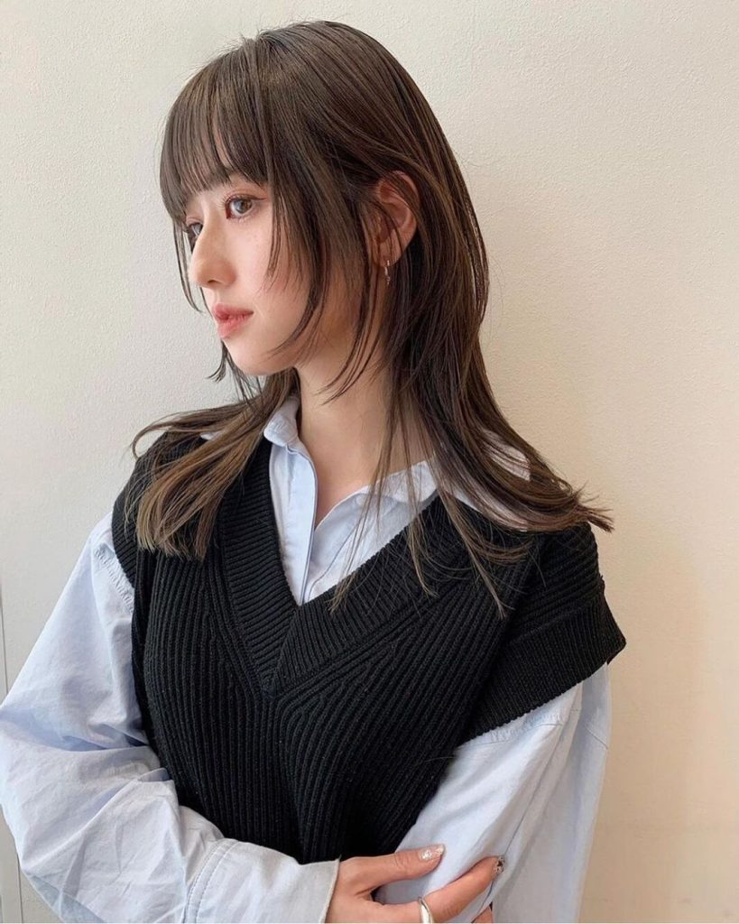 ナチュラルだけどシャレて見える、ニュアンスたっぷりなミディアムスタイル。フェイスレイヤーでムードのある顔まわりに。カラーは、品良く落ち着いた雰囲気のスモーキーベージュをセレクト。