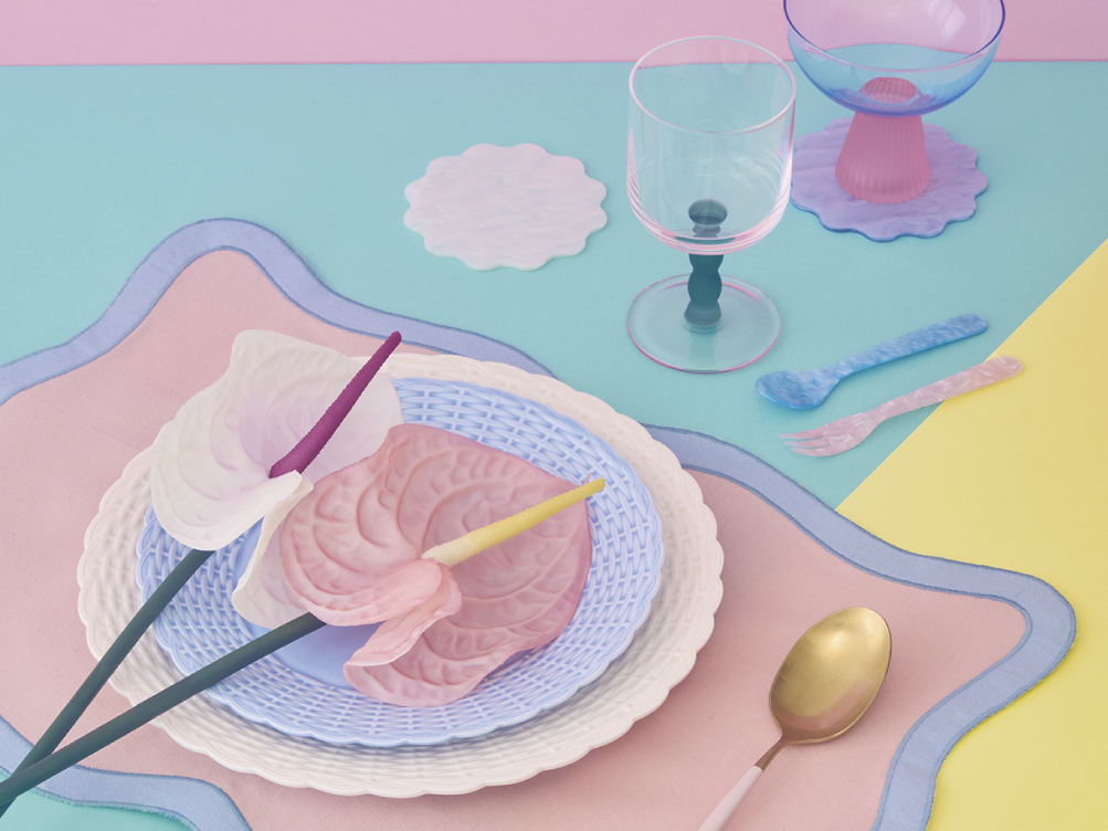 マーブル模様のカトラリーやウェーブデザインのランチマットなど、組み合わせ次第でいろいろなテーブルコーディネートが楽しめます。