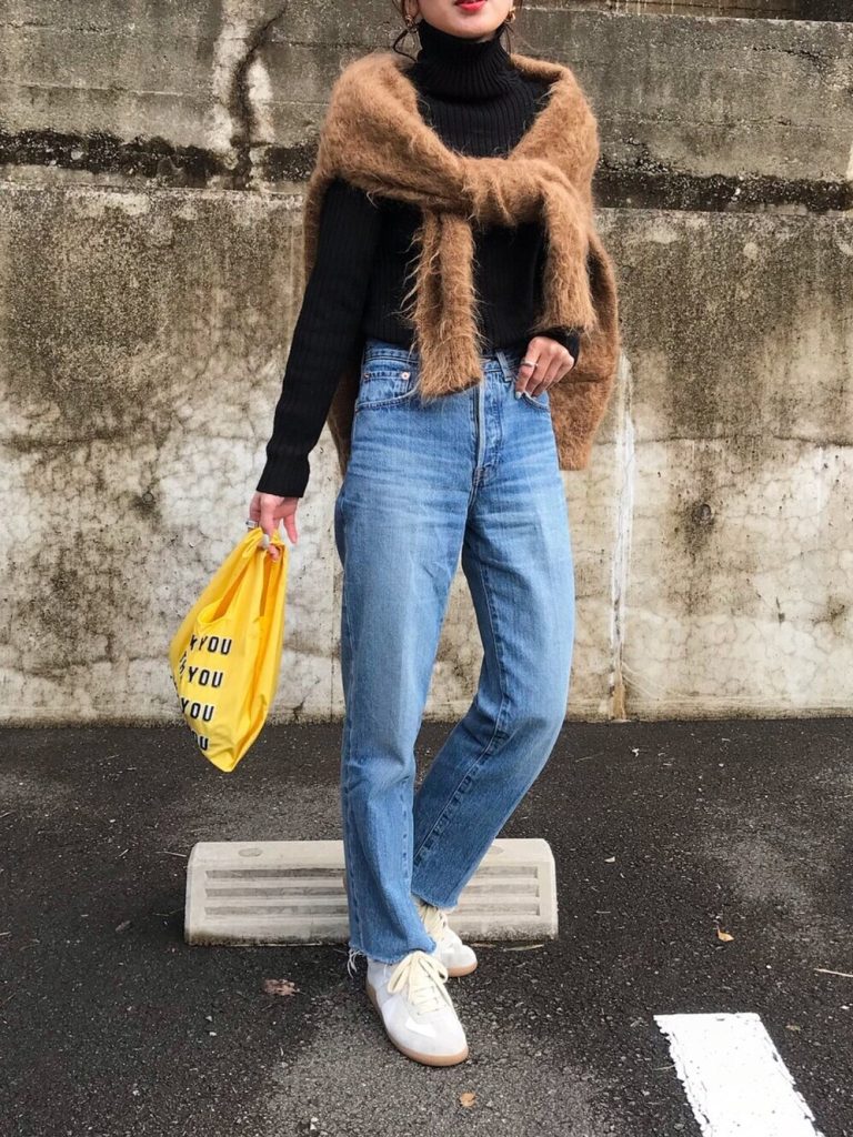 黒タートルニット&ブルーデニムの定番コンビに、モヘアのカーディガンで甘さをプラス。イエローのバッグが差し色になって抜け感アップ。