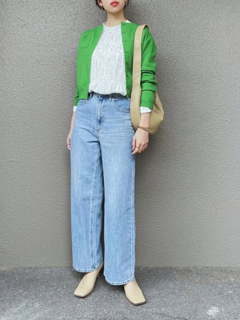 グリーンのカーディガンをジャケット代わりに羽織った、春のムードを感じるデニムスタイルです。足元はヌーディーベージュのパンプスを合わせて足長効果アップ。