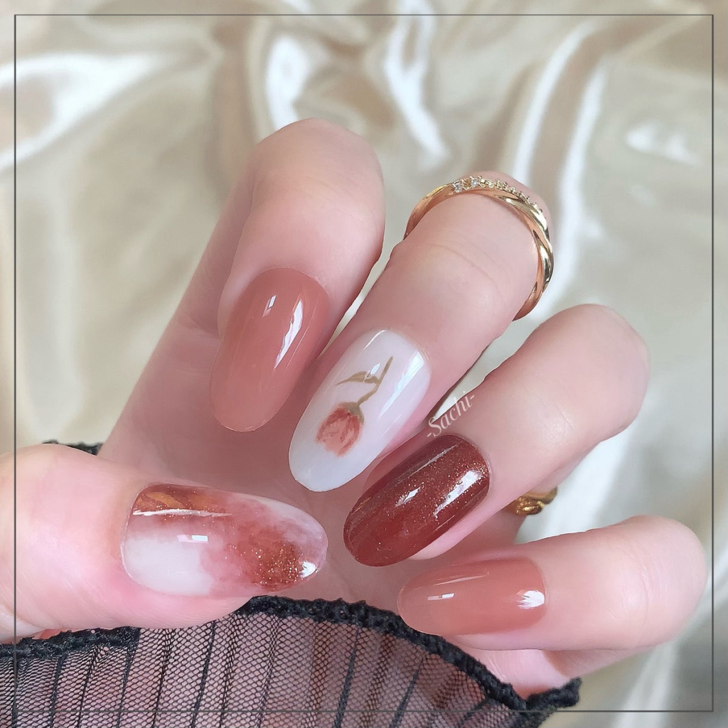 まるで絵画ように美しいデザインに見惚れてしまいます。大きめパールが手元を一気にゴージャスに!また手書きチューリップが繊細で美しいです。大人ブラウンを使ったチューリップデザインでシックにキメましょう。
