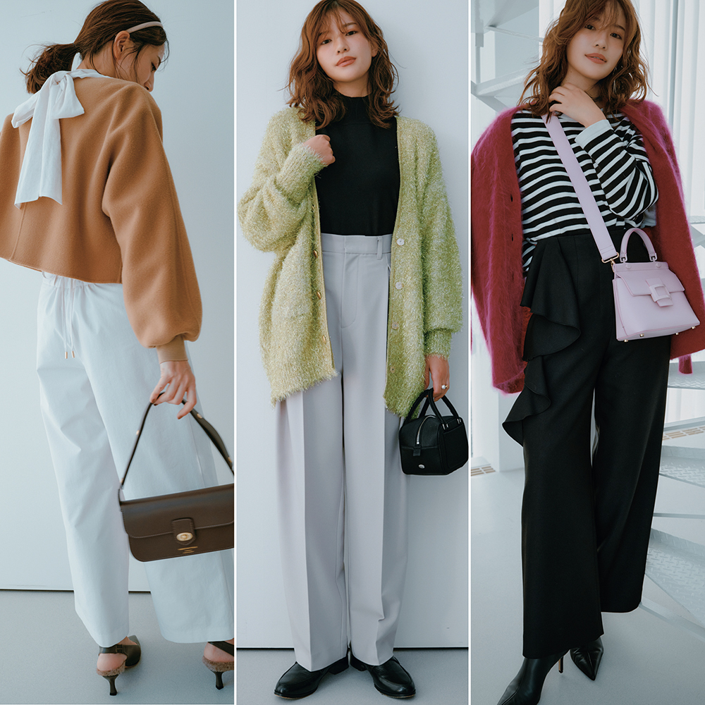 ラッフルワイドパンツ¥18,700(セルフォード/セルフォード ルミネ新宿1店)カーディガン¥47,300(デパリエ/デパリエ 伊勢丹新宿店)トップス¥38,500(ザ・ニューハウス/アーク インク)バッグ¥391,600(ロジェ ヴィヴィエ/ロジェ・ヴィヴィエ・ジャパン)ブーツ¥46,200(ピッピシック/ベイジュ)ピアス¥29,700(ブランイリス/ブランイリス トーキョー)