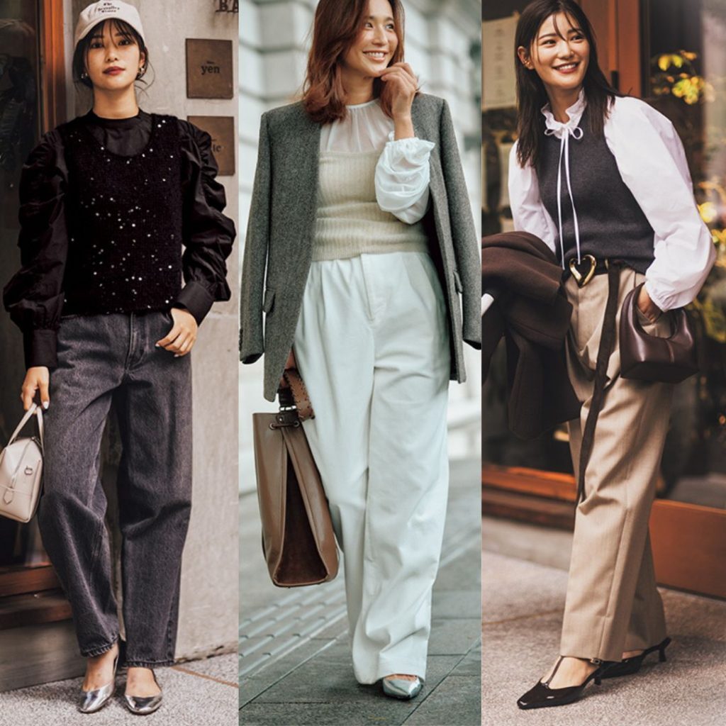 細ボウタイの甘ブラウスに ピタッとベストでメリハリを。 子連れシーンのパンツコーデも華やか