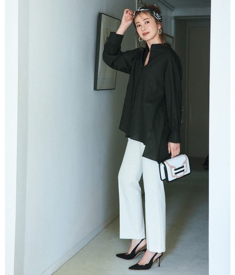首元のボタンを閉じるとスタンドカラーに変化。縦ラインが強調されて、よりスタイリッシュな印象になります。普段着にもオフィスコーデにも、オンオフ問わずヘビロテの予感。