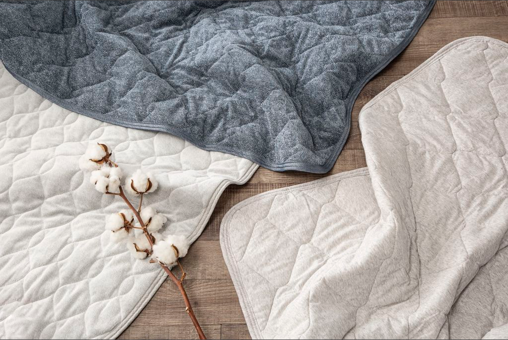 表生地は綿100%でふっくら、やわらか!細かいキルティングによるクッション性で、ベタつかず、さらりとした肌ざわり。もちろん自宅での洗濯も可能で、角のゴムバンドでしっかり固定できます。ナチュラルなホワイト、モカのカラバリ。