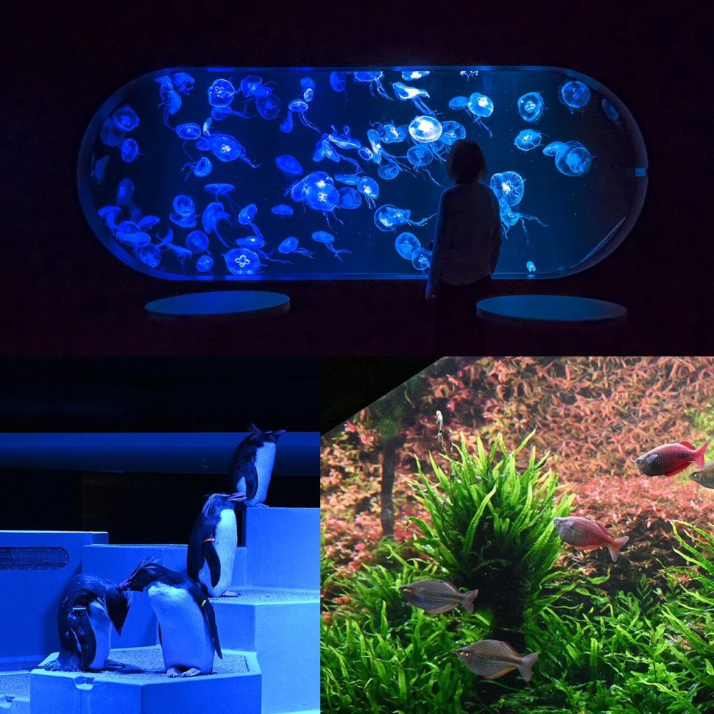 大小さまざまな水槽の中で、ミズクラゲなどがゆらゆら浮遊する姿がとってもキレイ。ここで生まれ育ったクラゲの仲間「カラージェリーフィッシュ」も飼育しています。小さな身体は、青や白、赤などさまざまな色が可愛らしく、定期的に訪れると成長していく姿も楽しめます。