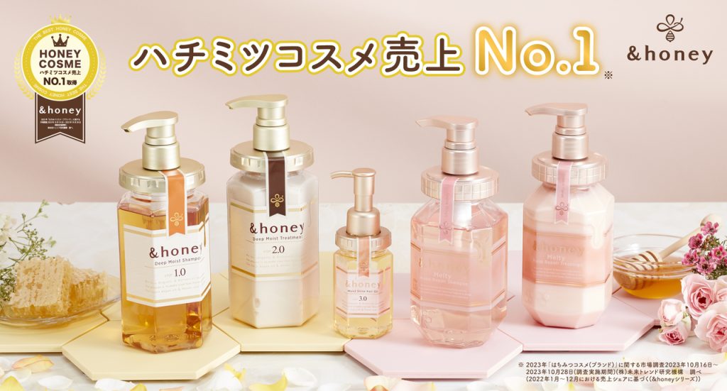 2018年にデビューしたナチュラルケアブランド「&honey」が、ハチミツコスメ売上シェアNo.1に!ヘアケアシリーズはもちろん、クレンジング、ボディウォッシュ、ハンドクリームなど様々なハチミツコスメを展開しています。