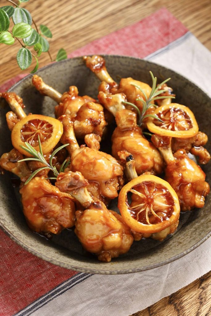手羽元に切れ目を入れて、ぎゅっと片側に寄せると、チューリップチキンのできあがり。はちみつとレモンの甘酸っぱい味つけもベストマッチ。あたたかくなってきた季節にさっぱりとした味が合います。