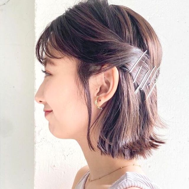 ゴールドのピンをバランスよく交差させた、作りすぎない無造作感と洗練されたアレンジは、誰もがおしゃれとみとめること間違い無し♡サイドがすっきりしている分前髪を重くすればバランスも◎