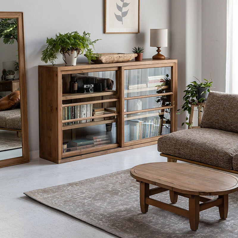 明治大正時代の水屋箪笥(食器棚)をモチーフにしたキャビネットは、ガラスの引戸にあしらわれた格子のデザインが目を引きます。上台部分にはお気に入りの食器や雑貨を飾って、下台引出しには細々したものを収納でききます。上台と下台は別々にも使えます。