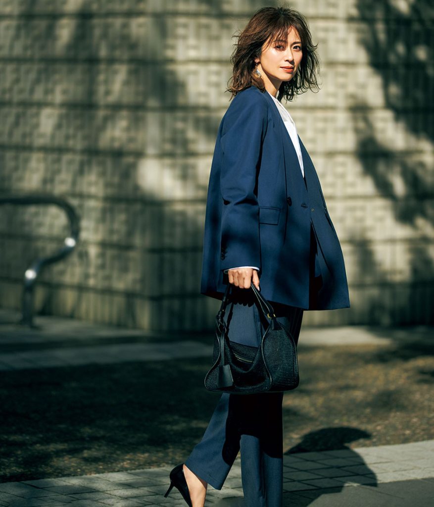 ジャケット¥37,400(ジャーナル スタンダード レサージュ/ジャーナル スタンダード レサージュ 丸の内店)ブラウス¥66,000(エストネーション/エストネーショングランフロント大阪店)パンツ¥29,700(ロエフ/ユナイテッドアローズ 原宿本店)バッグ¥31,900(オルセット/アルアバイル)パンプス¥35,200(ピッピシック/ベイジュ)ピアス¥35,200(リューク)