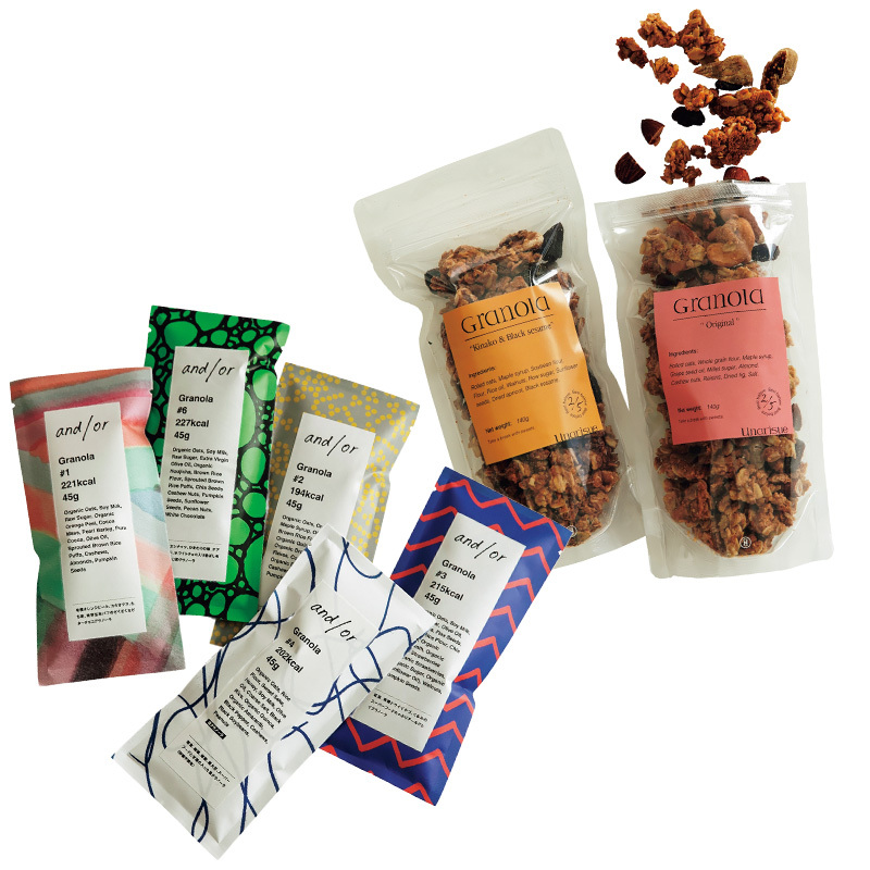 グラノーラと有機ドライいちぢくのゴロッと食感が美味!右から、オリジナルグラノーラ 黒胡麻きな粉グラノーラ各¥1,650(ともにユーネリス)