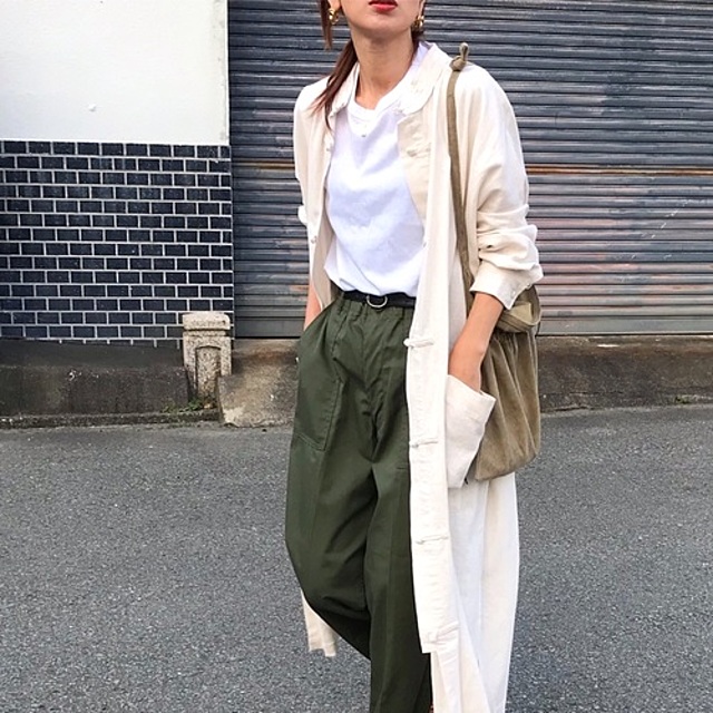 カジュアル味のある、ベージュのタイトスカートを合わせたコーディネート。デニムコーデと同様、カジュアルな素材のボトムスを合わせても品よくまとまるので、きれいめなカジュアルスタイルが簡単に完成します。やや長め丈ではあるものの、ウエストにインしても嵩張らず着こなせるのも優秀!