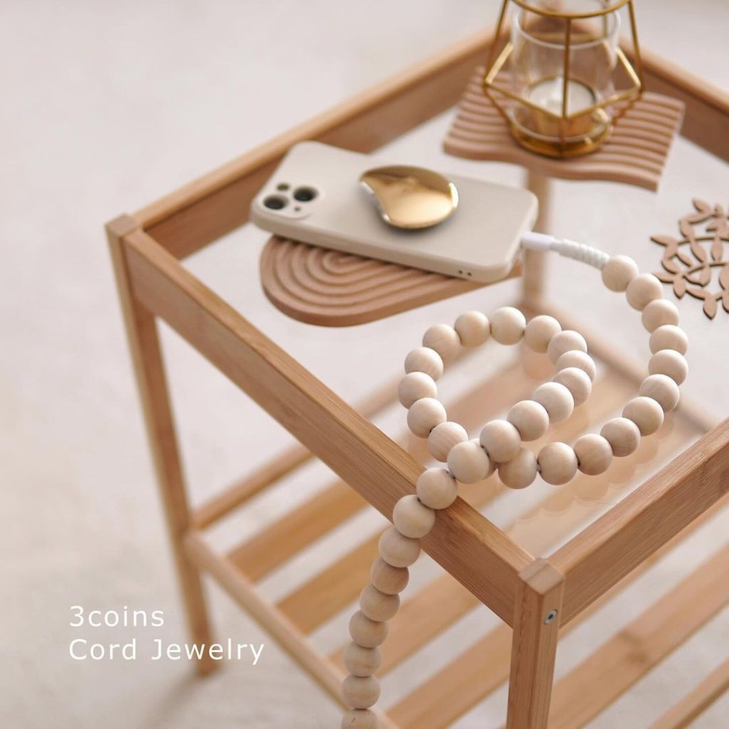 スマホやタブレットの充電や同期ができるケーブルは、出しっぱなしだと生活感も丸出しになります。ウッドビーズを通したコードジュエリーなら、出しっぱなしでもおしゃれ!あたたかみのあるデザインです。