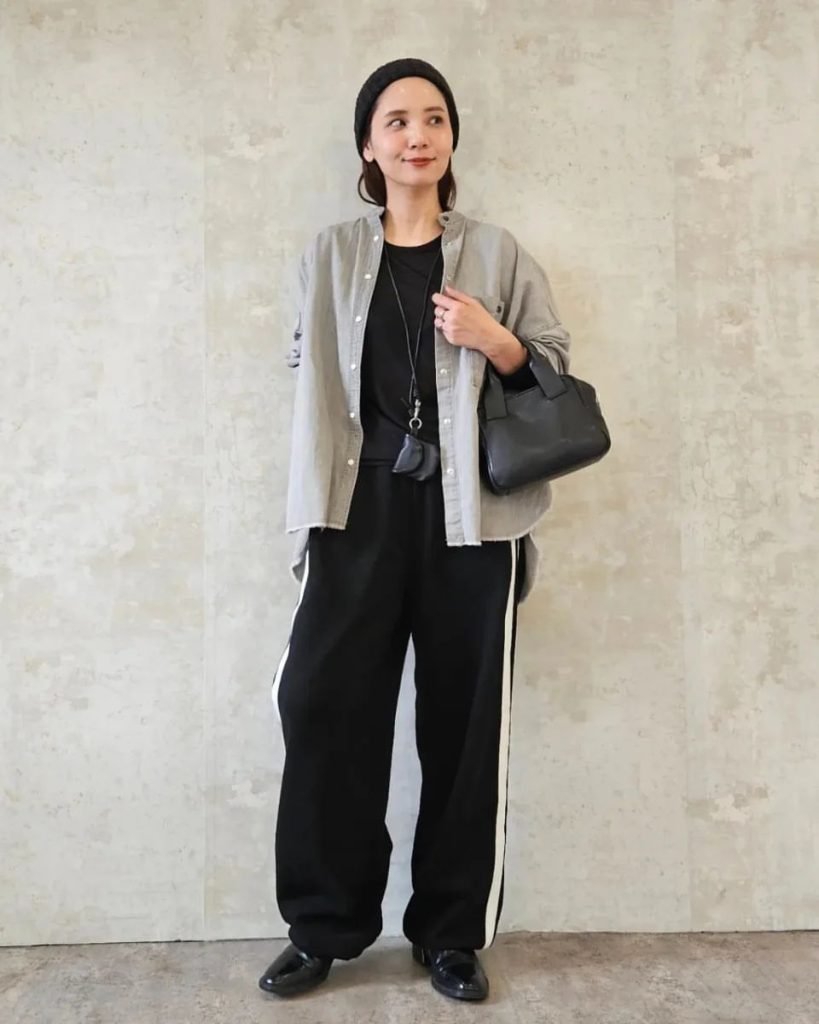 デニムシャツ&トラックパンツのスポーツMIXスタイルも、モノトーンならぐっと落ち着いた印象に。あえてキレイめな靴を合わせるのもポイントです。