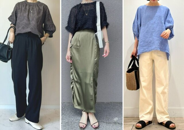 フェミニンなブラウスとカジュアルなパンツで甘辛バランスに。白系のワントーンでまとめつつ、黒の小物で引き締めてメリハリを意識。