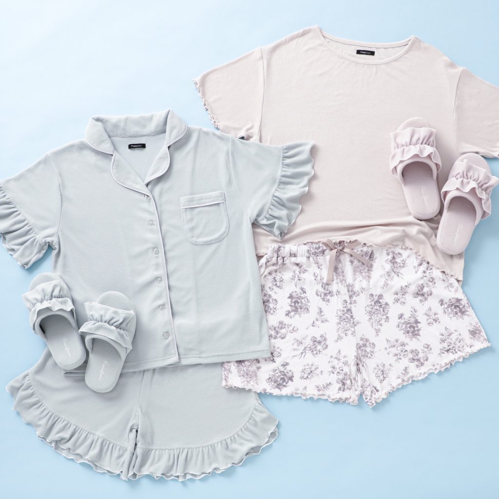 触れるとひんやり感じる接触冷感加工生地に、抗菌防臭機能もプラス。パジャマはゆったりしたシルエットのとろみ素材を使用、カップ付きワンピースはほどよいマーメイドシルエットでどちらもリラックス感満点♡今年からルームシューズも追加されたので、トータルコーデが楽しめます。