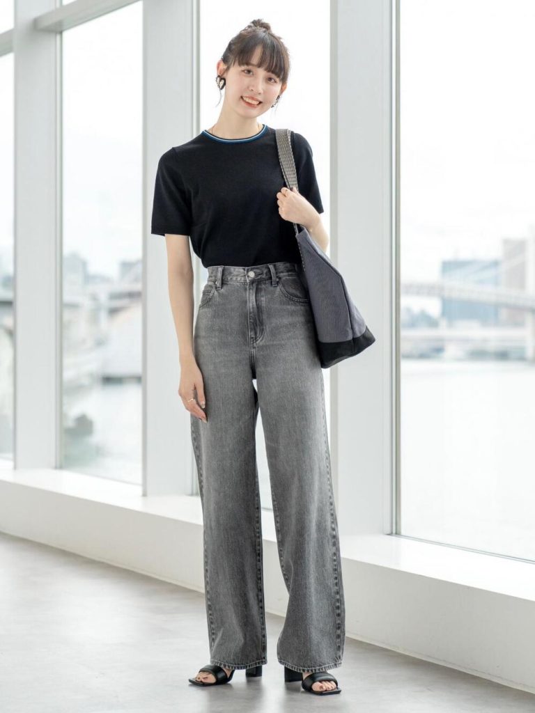 リラックス感があるワイドシルエットでも、ストレートなラインで脚がすらりときれいに見えるジーンズ。グレーはクールでこなれた表情を作ります。