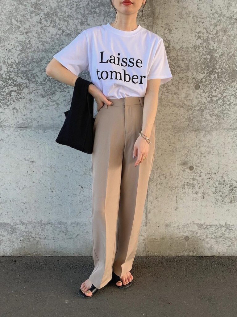 グレージュのTシャツ×きれいめパンツでクール系なスタイリングに。サンダルで素肌感を出すことで、色の重さを払拭。アクセサリー使いも参考にしたいポイントです。